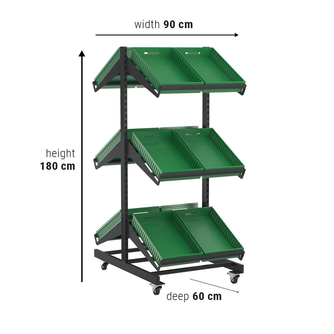 Our vegetable and fruit display units are for indoor and outdoor use. The unit provides high visibility of your products and items and it’s designed with strong wheels to be placed as desired. It is easy to clean and is wall mounted.perfect for those looking for a mobile fruit and vegetable stand.